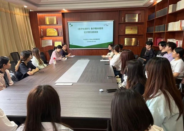 4月16日上午,美女图片大全 伦理学教研室在学院会议室召开《医学伦理学》数字教材使用征求意见师生座谈会。教研室全体教师及各专业学生代表参加了会议。