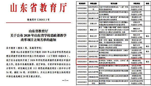5月29日,山东省教育厅公布了“2020年山东省学校思政课教学改革项目立项名单”,美女图片大全 申报的《医学院校“多载体、分层次、立体化”思政课实践教学模式研究》喜获重点项目立项。