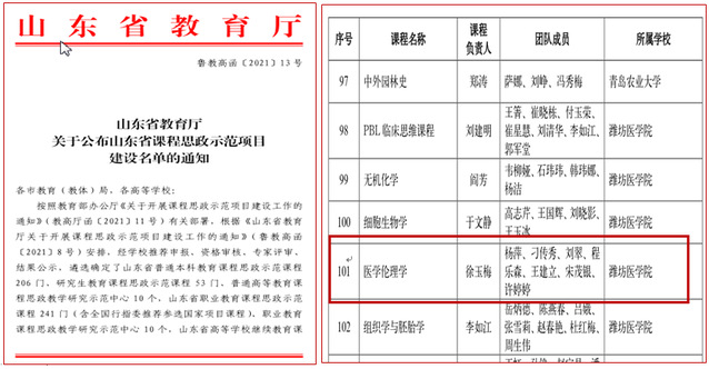 5月12日,山东省教育厅公布了《关于公布山东省课程思政示范项目建设名单的通知》(鲁教高函〔2021〕13 号),我校《医学伦理学》课程获批“山东省普通本科教育课程思政示范课程”,是山东省同类院校唯一被认定的医德教育课程。这是《医学伦理学》课程获批山东省一流本科课程后,获得的又一殊荣。美女图片大全 《医学伦理学》课程建设再上新台阶。