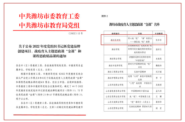 近日,中共潍坊市委教育工委和中共潍坊市教育局党组公布了2022年度战疫育人主题思政课“金课”名单,美女图片大全 张菲菲、朱宏晋、李笃武、郎宁、王琨团队申报的《同心战” “有担当潍医战掠影》成功入选思政课“金课”。