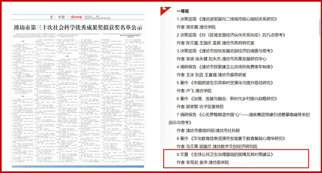 近日,潍坊市第三十次社会科学优秀成果奖获奖名单公布,美女图片大全 教师喜获佳绩,一等奖1项,二等奖1项,三等奖1项。其中,美女图片大全 李笃武、袁萍申报的理论文章《全球公共卫生治理面临的困境及其对策研究》获一等奖;于芳、徐玉梅和杨萍申报的课题《习近平总书记关于健康中国重要论述的实践路径研究》获二等奖;郝明扬、李良和李笃武申报的著作《拓荒牛——创新创业教育理论体系及实践研究》获三等奖。