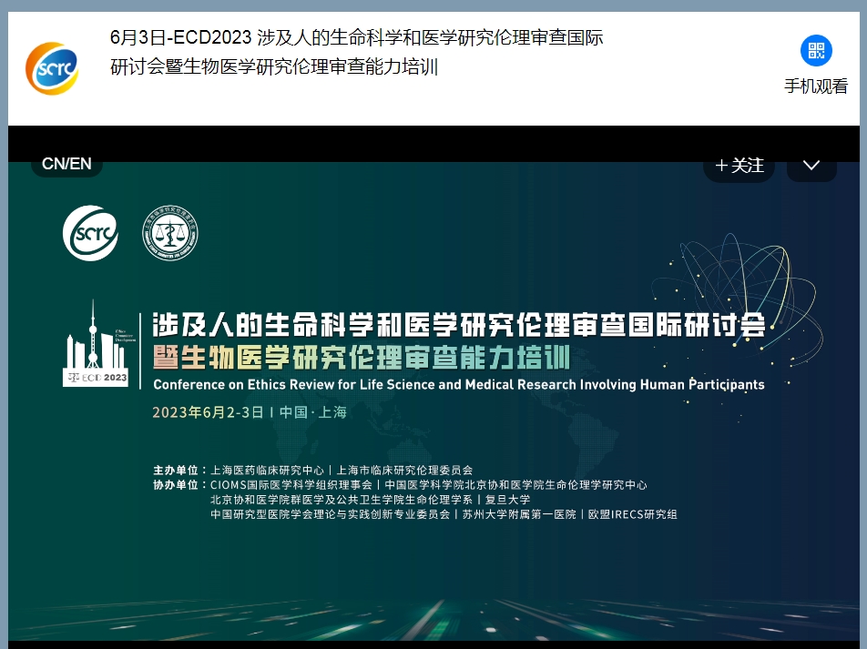6月2日-3日,由上海市医药临床研究中心、上海市临床研究伦理委员会主办的“ECD2023涉及人的生命科学和医学研究伦理审查国际研讨会暨生物医学研究伦理审查能力培训”第一期活动,在上海于线下线上同时举行。该期主题为“涉及人的生命科学和医学研究伦理审查国际研讨会”。